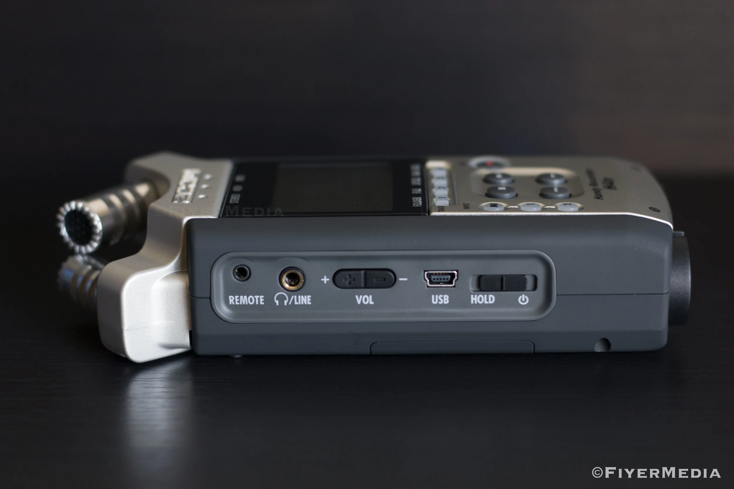 On the other side as you can see you can connect a remote, headphones, adjust the volume of what you hear in the headphones and a micro USB port. This is the side you turn the Zoom on and off.